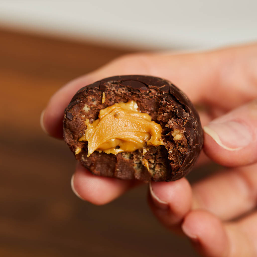 A plant protein packed choc brownie ball filled with a deliciously squishy nut butter centre and coated with choc!